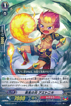 Flame of Strength, Aetniki also utilize the retire engine of Kagero. When an opponent RG is put to drop zone due to effect. you may put Aetniki to soul and unflip up to 2 damage.